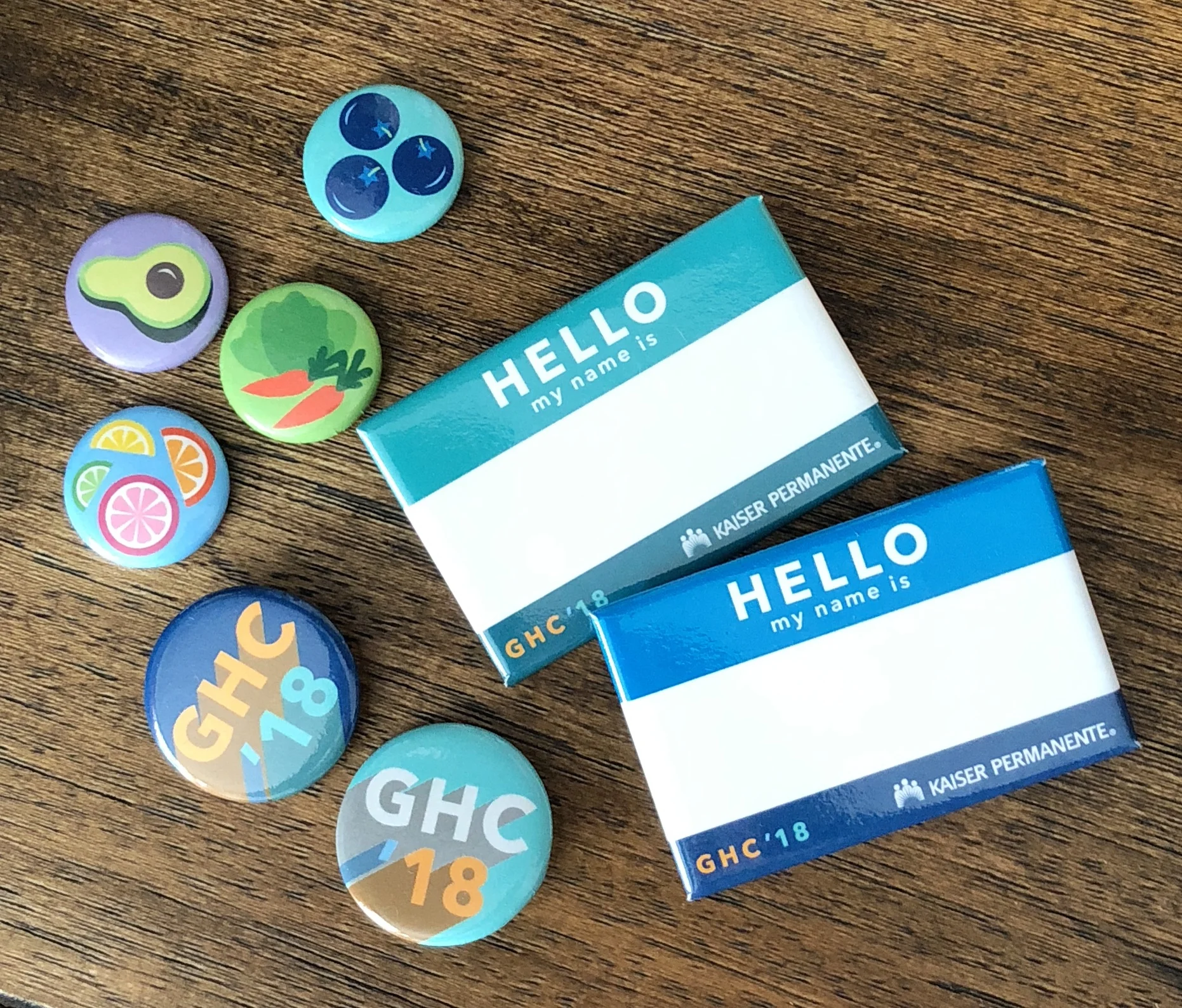 Finally, some custom illustrations on collectible buttons served as swag, a decision I made after observing the popularity of “button bars” among the attendee age group at other conferences. The buttons portrayed fruits and veggies to convey healthy living in a fun and colorful way, and a handy nametag button (bonus: our brand and booth number were also on the back of each pin). The team reported that attendees came to the booth specifically to collect these.
